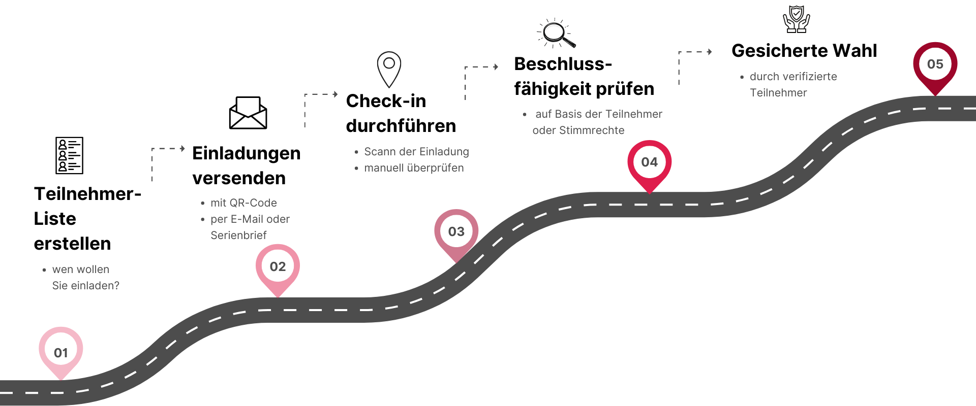 Über eine separate ScanFunktion scannen Mitarbeiter die Einladungen (Mail oder Brief) ab und erst danach kann der Teilnehmer abstimmen. Zusätzlich kann jeder Teilnehmer beliebig manuell ein- und ausgecheck werden.