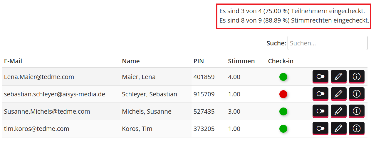 Wie viele Teilnehmer sind aktuell eingecheckt? Wie viele Stimmrechte? Und wie viele waren es bei den einzelnen Abstimmungen?