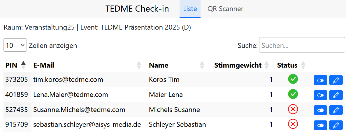 Lassen Sie Ihre Teilnehmer mit TEDME einchecken und geben damit die Teilnahme an der Wahl frei.