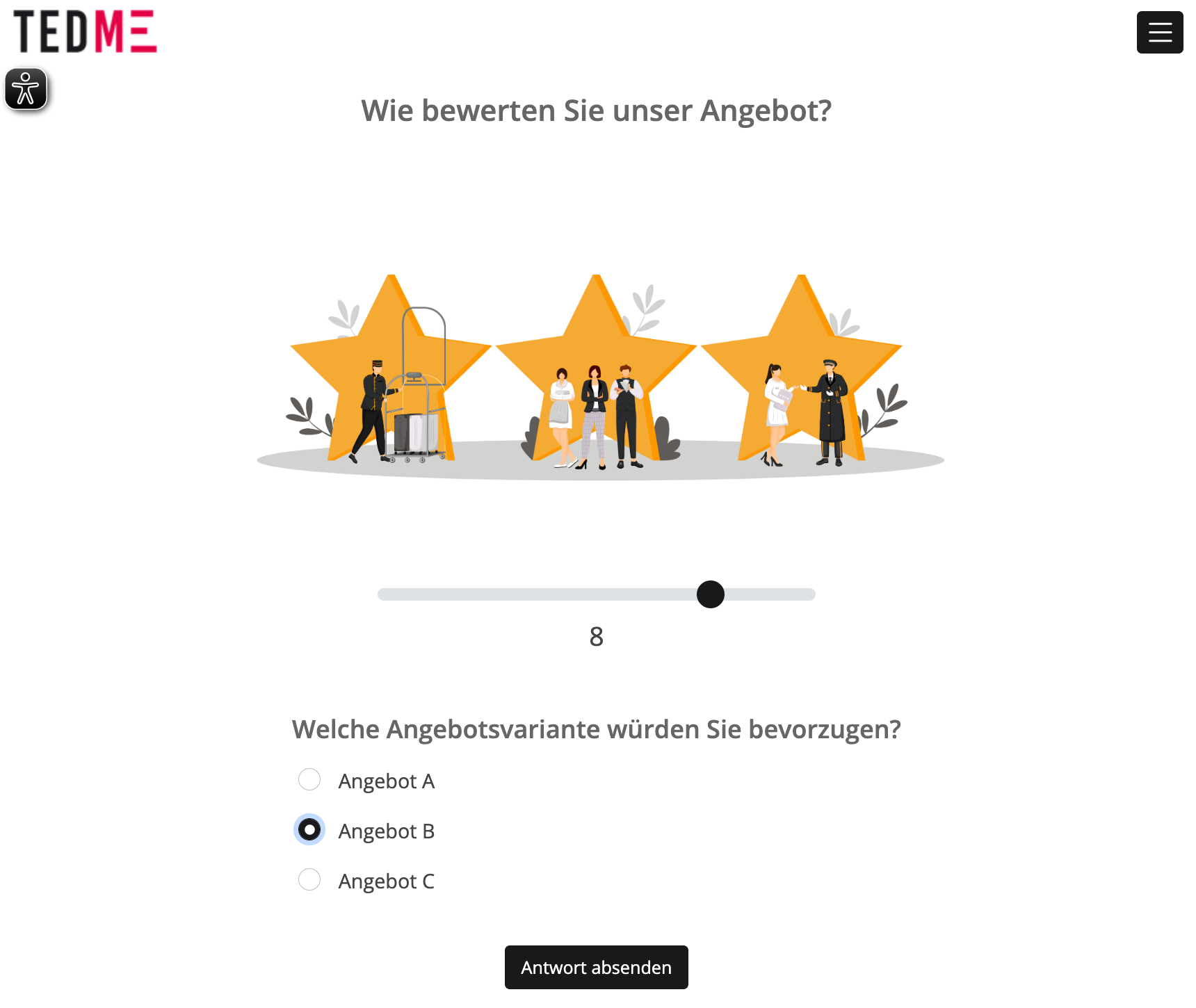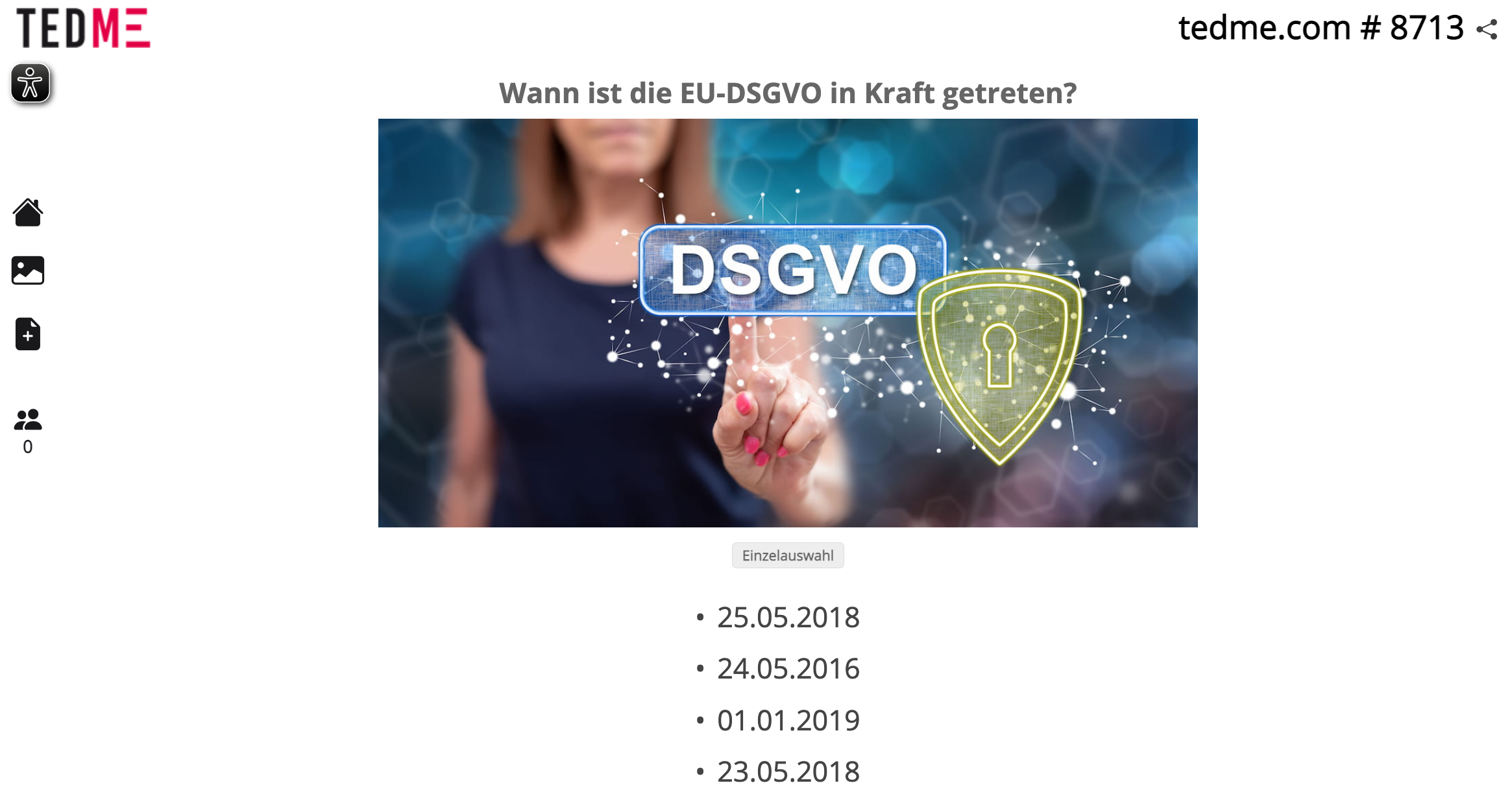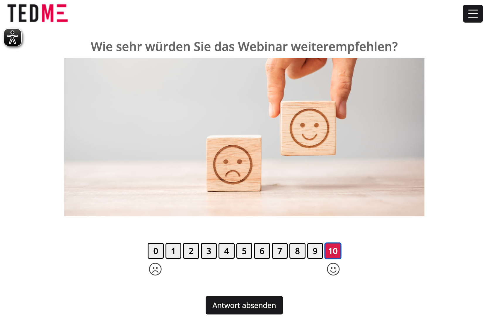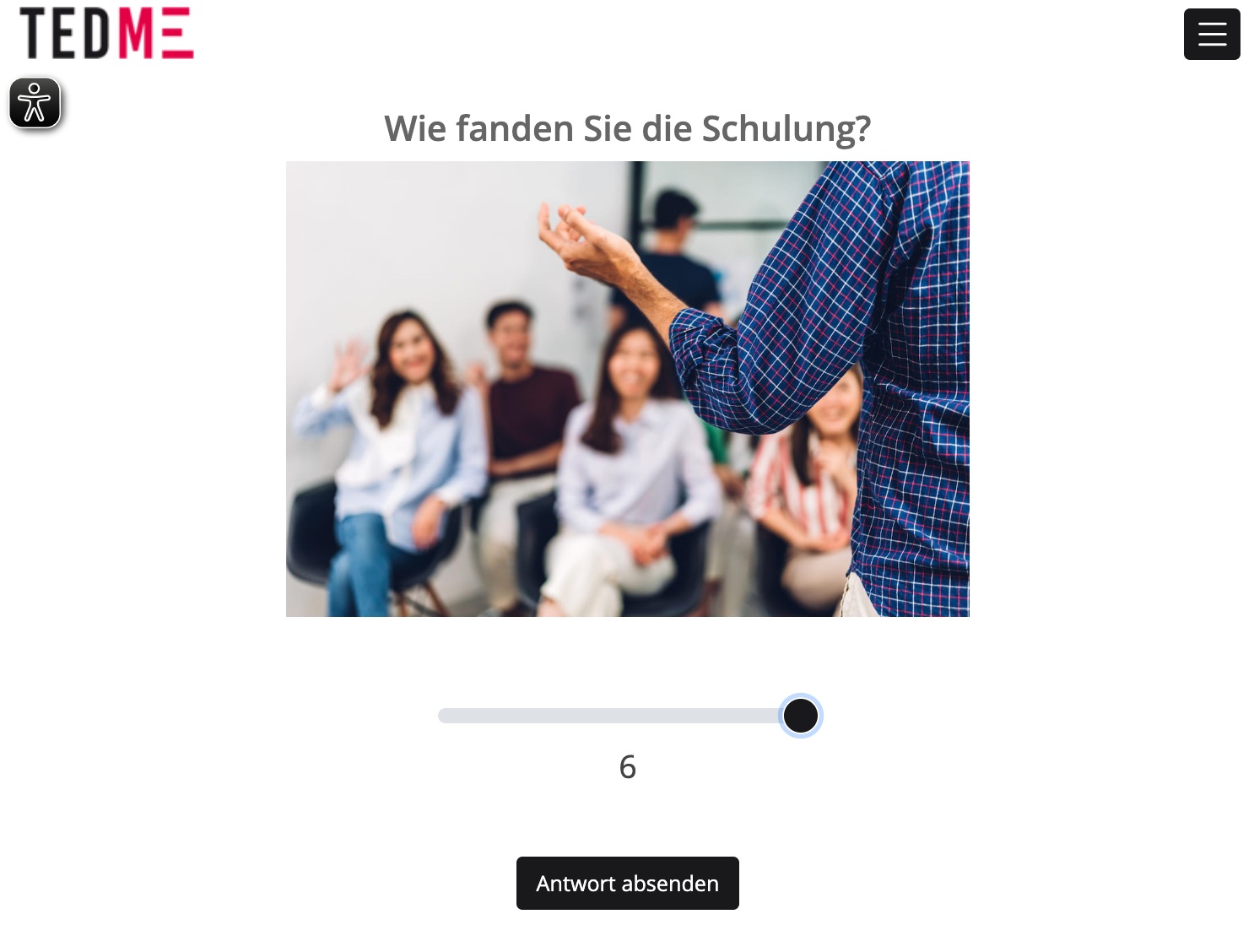Ob Sie nun Vorwissen abfragen oder ermitteln wollen, wer wie gut aufgepasst hat, mit Quiz-Fragen gelingt Ihnen genau das. Mit TEDME können Quizzes wie bei “Wer wird Millionär?” umsetzen und auch gleich die richtigen Antworten anzeigen lassen.Zweistufige Frage