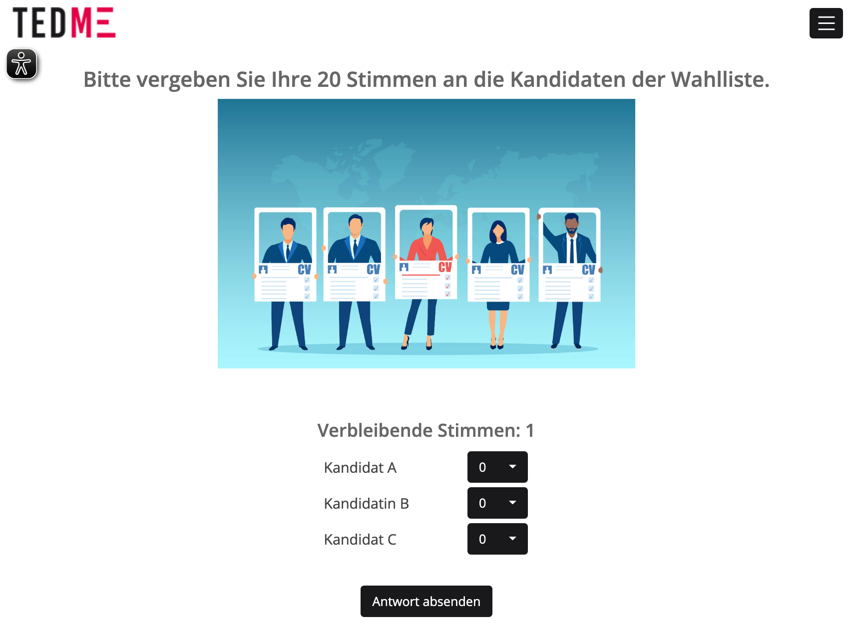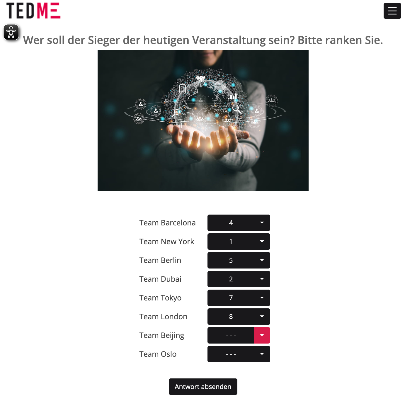 Eine Variante, mit der Sie die Antworten Ihrer Teilnehmer in eine Reihenfolge bringen können. Gerade bei Pitches ist das super interessant. Wer soll auf das Siegertreppchen und wer hat maximal Platz vier verdient? Ein Ranking liefert die Antwort(en).